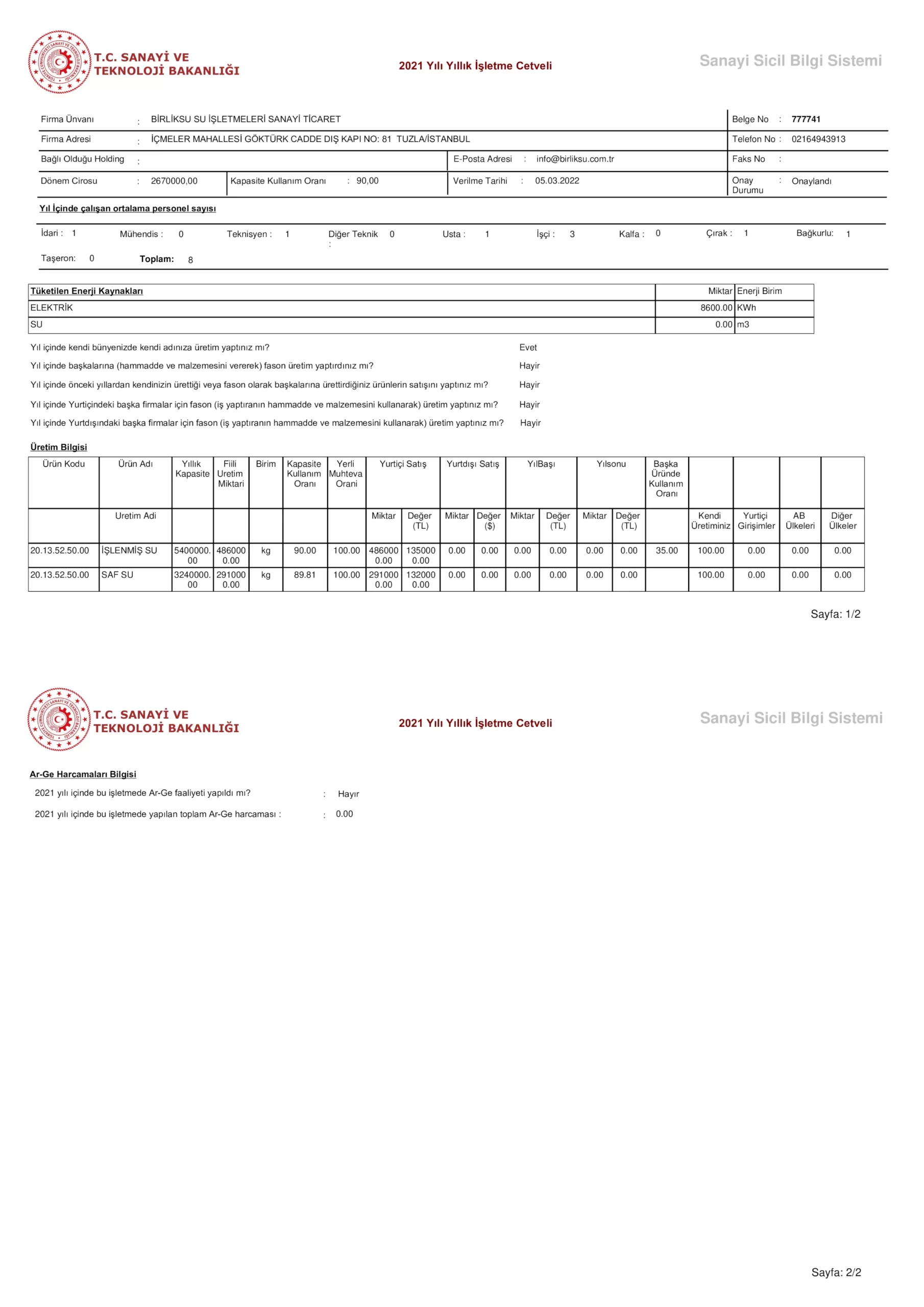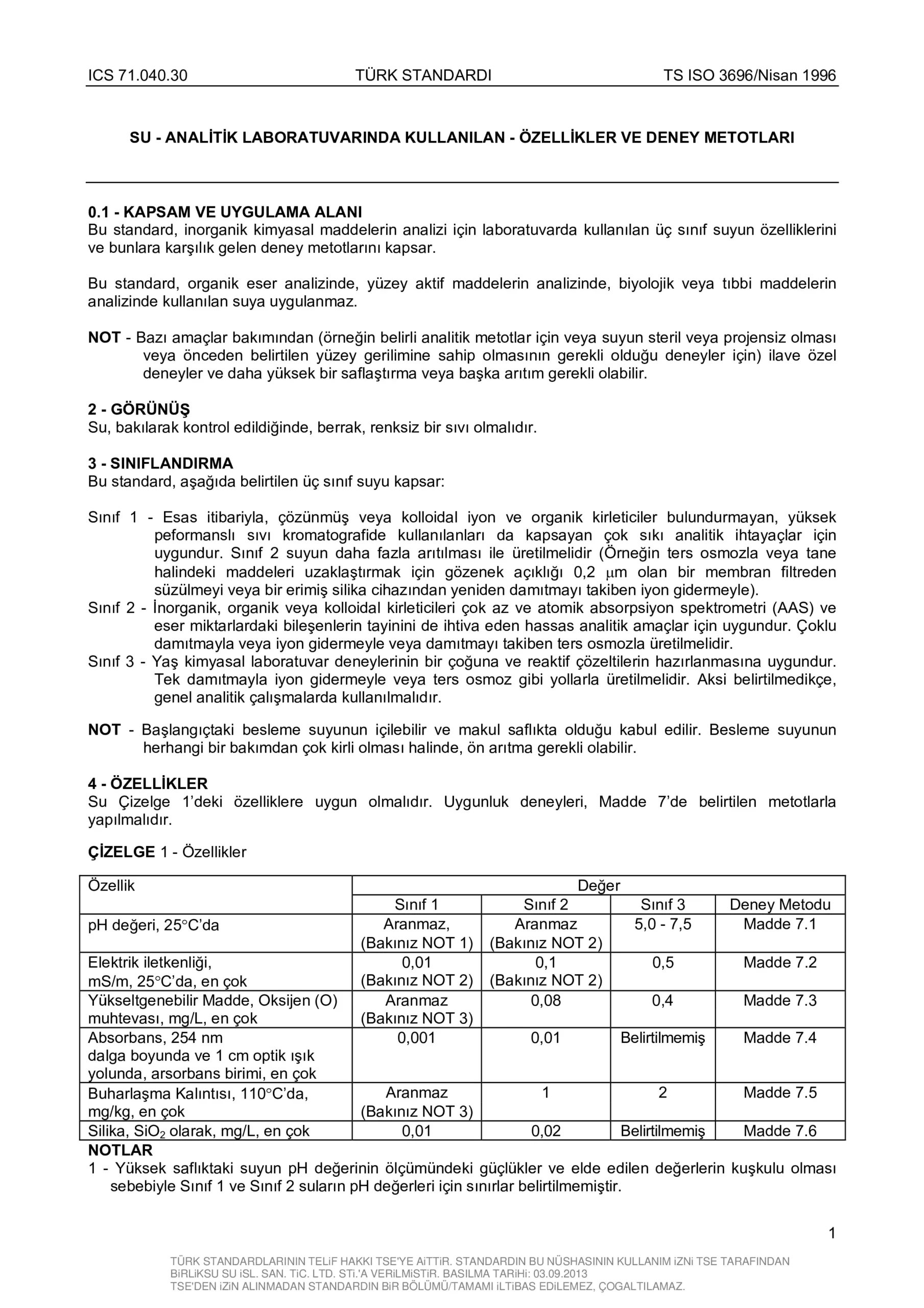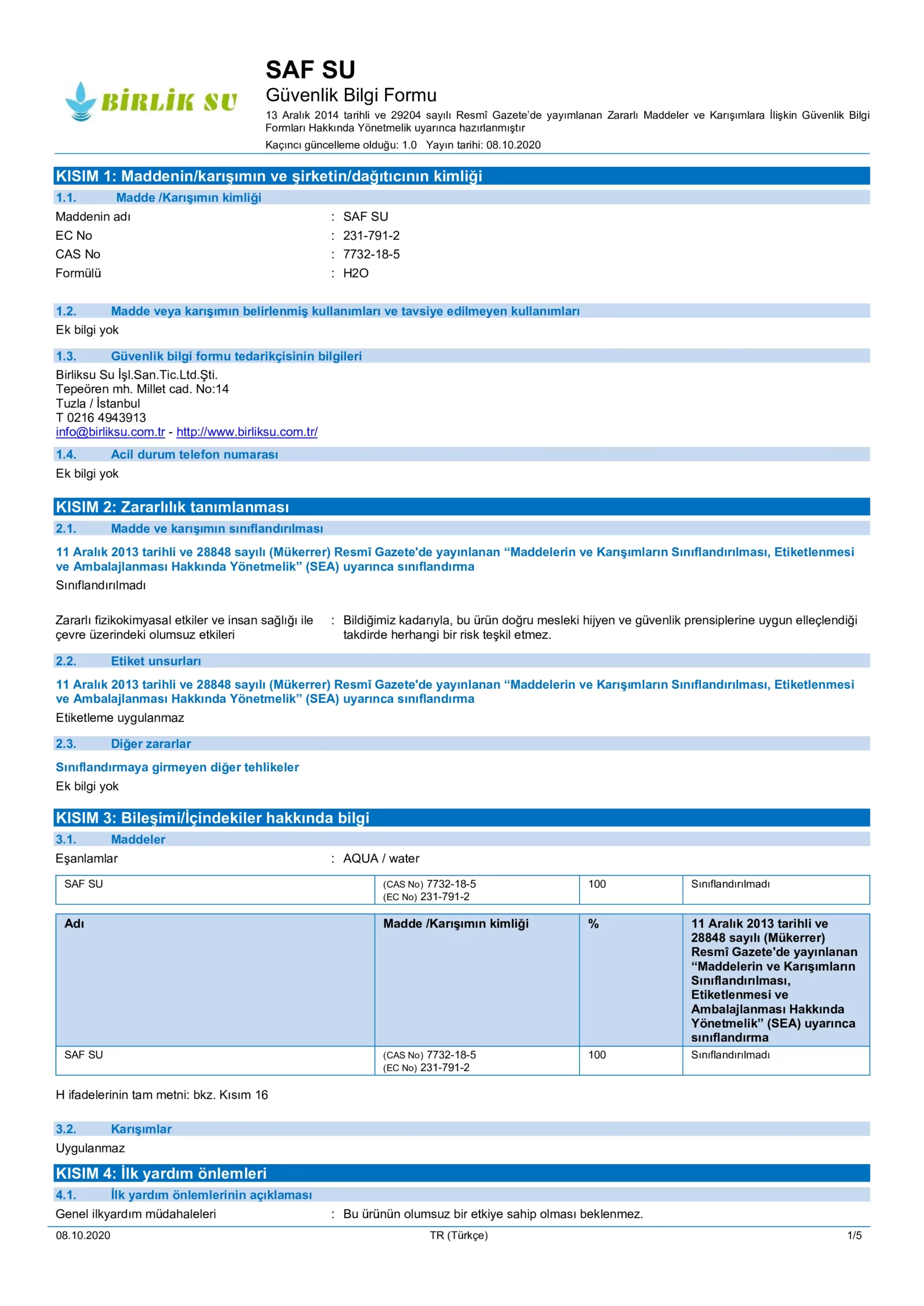 Saf Su Analiz Belgesi